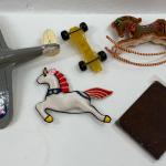 Misc Doo-Dads Lot - Plastic Plane And Car, Rocking Horse, Puffy Unicorn Patch, E (7 photos)
